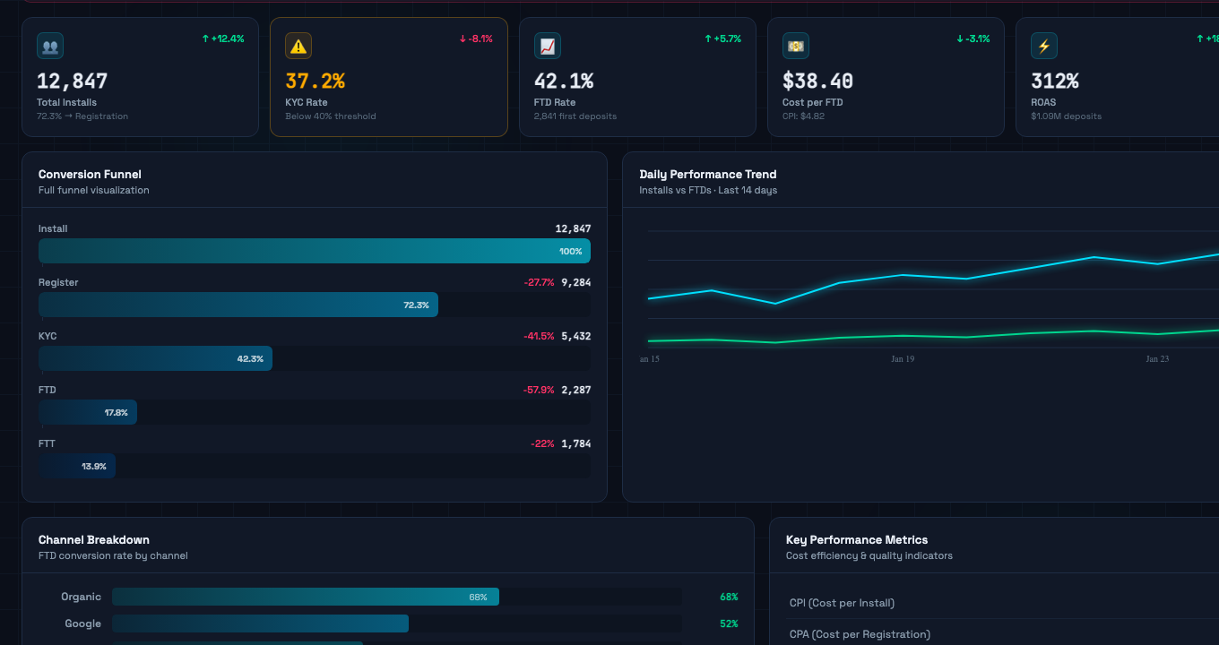 Growth KPIs: cost per FTD, quality-adjusted LTV/CAC.